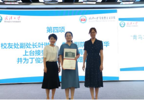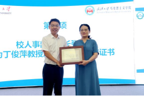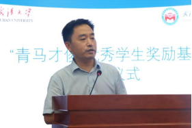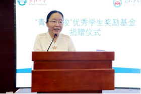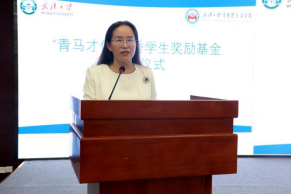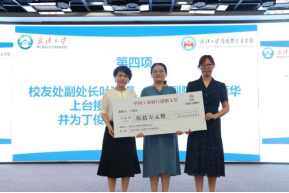 捐赠完成后,丁俊萍教授上台发表讲话。丁俊萍教授表达了对学校、学院、恩师、同事和所教过的学生、父母和家人的由衷感谢,她动情地说道:武汉大学提供给我不断成长的机会和施展才华的舞台,没有学院和学校的强力推荐和帮助,也就不可能有今年50万元的捐赠;恩师高尚的品德、精湛的学术为我效力武汉大学奠定了坚实的基础,来到武大后,比我年长的老师带着我搞教学、做科研、同辈的老师们与我团结合作、共同创业,年轻教师展露的朝气锐气激励我努力学习、不断进步;作为老师,课堂上与课堂外我感到自己在和学生一起共同进步;年少时,我家里生活艰难,但父母千方百计地支持我上学;成家后,我的爱人更是毫无保留地支持我的学业和工作,没有家人的理解和支持,我也不可能走到今天。在讲话的最后,丁俊萍教授更是特别感谢了党领导人民共同奋斗的伟大时代,正是在改革开放和国家教育强国战略实施的影响下,丁俊萍教授才得以躬耕杏坛,用热情、热爱、热忱谱写了铸魂育人的华章。