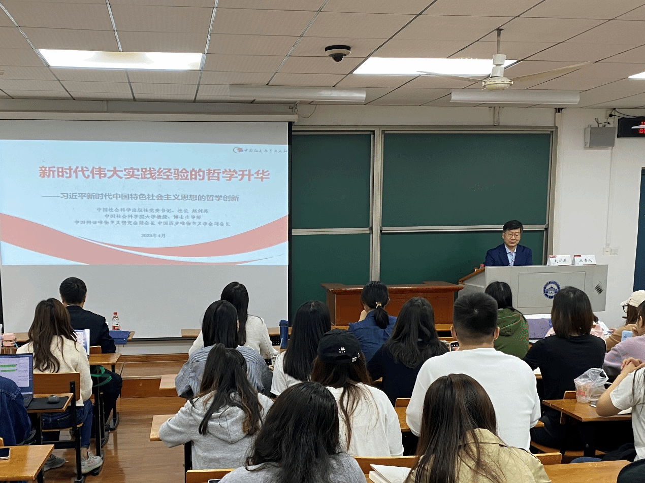 接着,赵剑英教授结合习近平总书记在庆祝中国共产党成立100周年大会上的讲话、党的二十大报告以及习近平总书记在文化传承发展座谈会上的最新讲话精神,阐释了习近平新时代中国特色社会主义思想的哲学精髓,阐发“两个结合”和“六个必须坚持”在开辟马克思主义中国化时代化新境界中的重大意义。赵剑英教授带领大家细致梳理了“两个结合”的提出和阐释过程,深入探讨了中华优秀传统文化同马克思主义的“根”“魂”作用,着重分析和回答了为什么说“第二个结合”是又一次的思想解放。整体阐发了“六个必须坚持”何以是对马克思主义基本立场、观点、方法和中国哲学思想智慧的传承发展。赵剑英教授还以中国式现代化理论体系为范本,从中国式现代化的最终目标、中国式现代化的共性与特色,以及推进中国式现代化的辩证法,阐述了中国式现代化理论体系所蕴含的哲学思想,使大家对习近平新时代中国特色社会主义思想哲学精髓的理解更加深刻、立体。