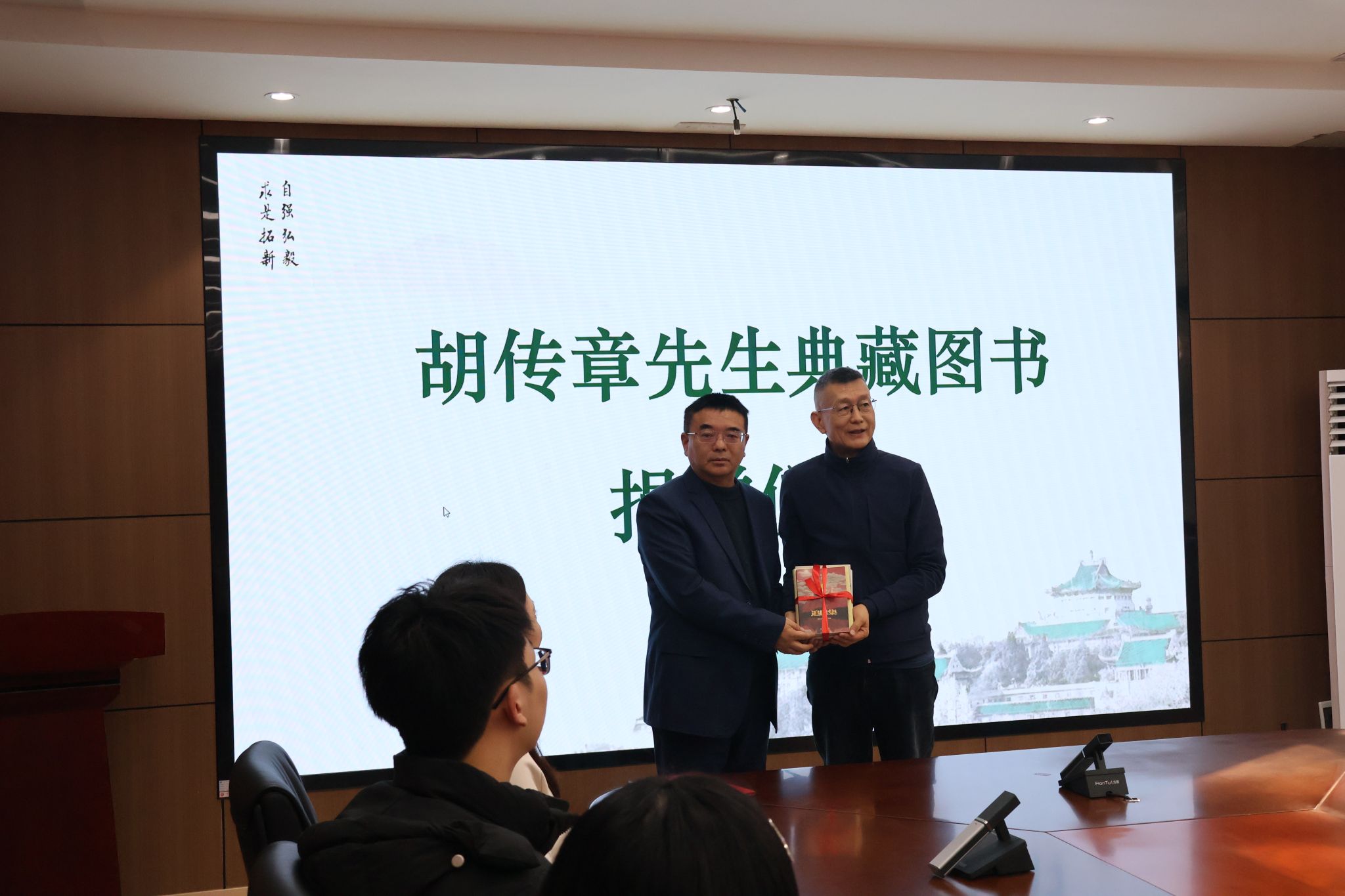 胡传章先生长子胡松代表胡传章先生家属捐赠图书,罗永宽代表学院接受捐赠并向胡松颁发捐赠证书。