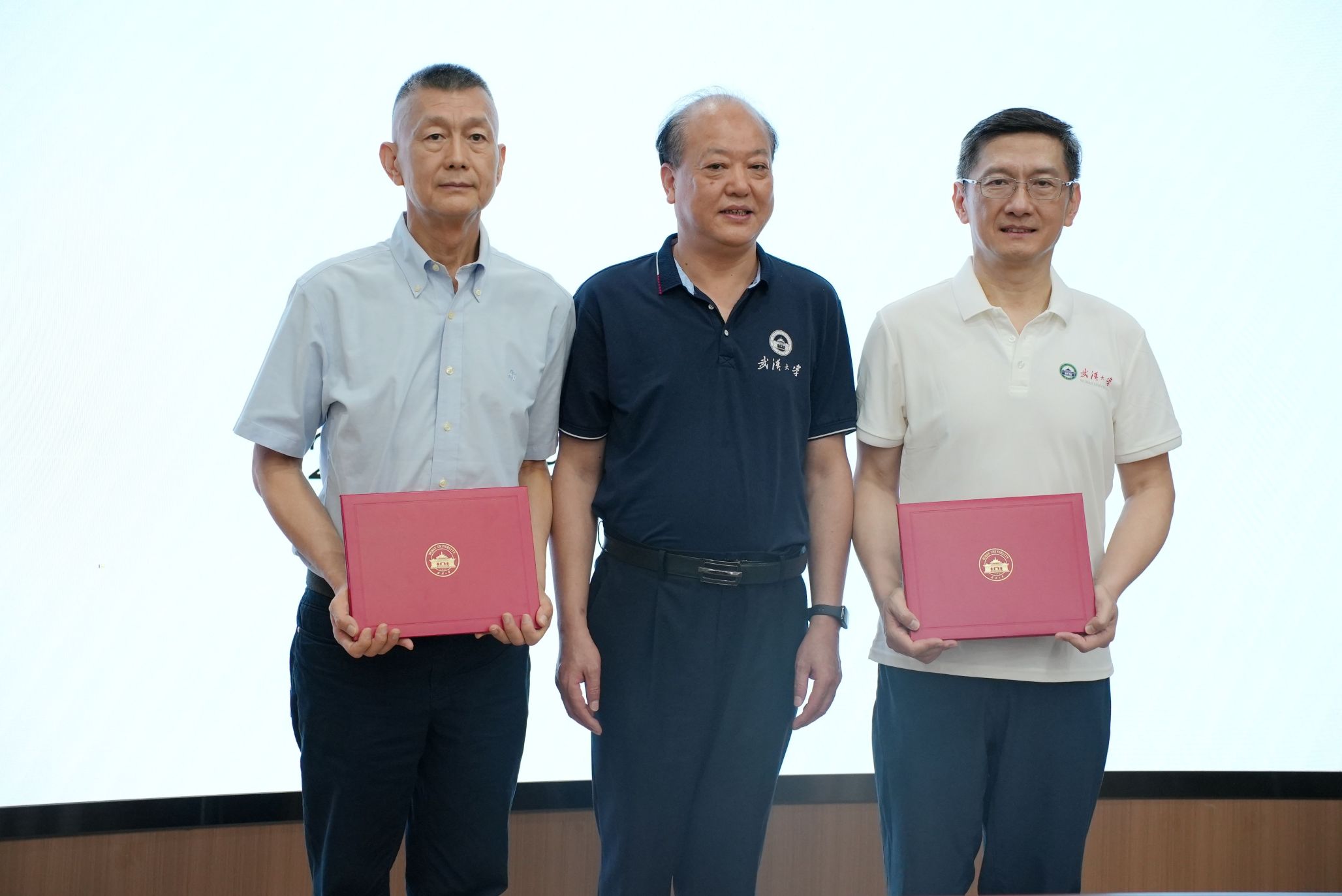 武汉大学教育发展基金会秘书长邓小梅与胡松先生签署捐赠协议。李资远为胡光、胡松颁发捐赠证书。