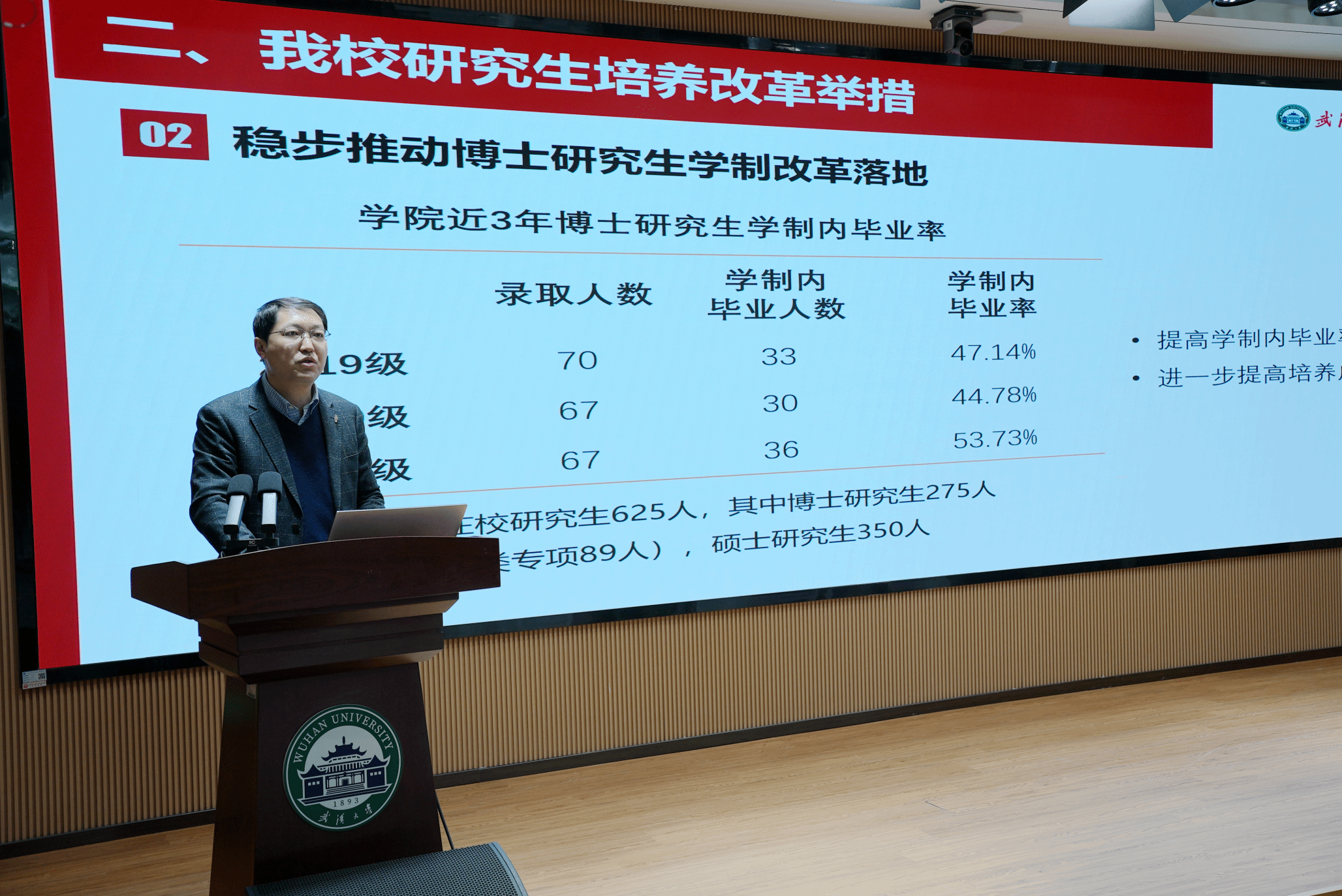 学院副院长刘水静教授做研究生教育改革发展专题汇报。他从学院研究生教育改革发展基本情况与取得成绩、所面临的问题和挑战、下一步的思考与举措三个角度进行全面具体的汇报。