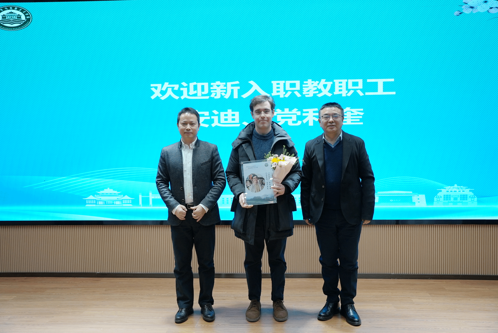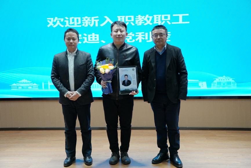 首先,大会欢迎最新入职的教职工,特聘副研究员安迪老师和博士后党利奎老师上台做自我介绍。张全友书记和罗永宽院长为两位老师送纪念相框和鲜花。