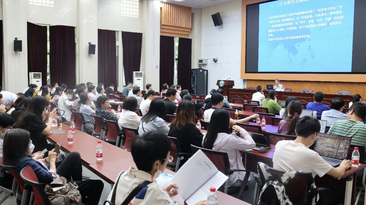 5月18日下午,学院党委召开学习贯彻习近平新时代中国特色社会主义思想主题教育读书班第八次集中学习会暨党委理论学习中心组(扩大)报告会。武汉大学人文社会资深教授、校中国边界与海洋研究院院长、国家领土主权与海洋权益协同创新中心主任、首席专家的胡德坤教授以“擘画世界——习近平中国共产党第二十次全国代表大会报告的世界历史意义”为题作专题辅导报告。学习会由学院党委书记罗永宽主持,学院领导班子成员、全体教职工党员、学生党支部书记及部分学生党员代表等参加会议。