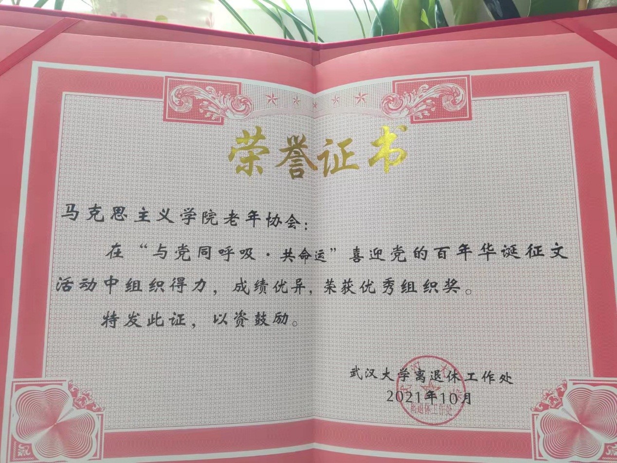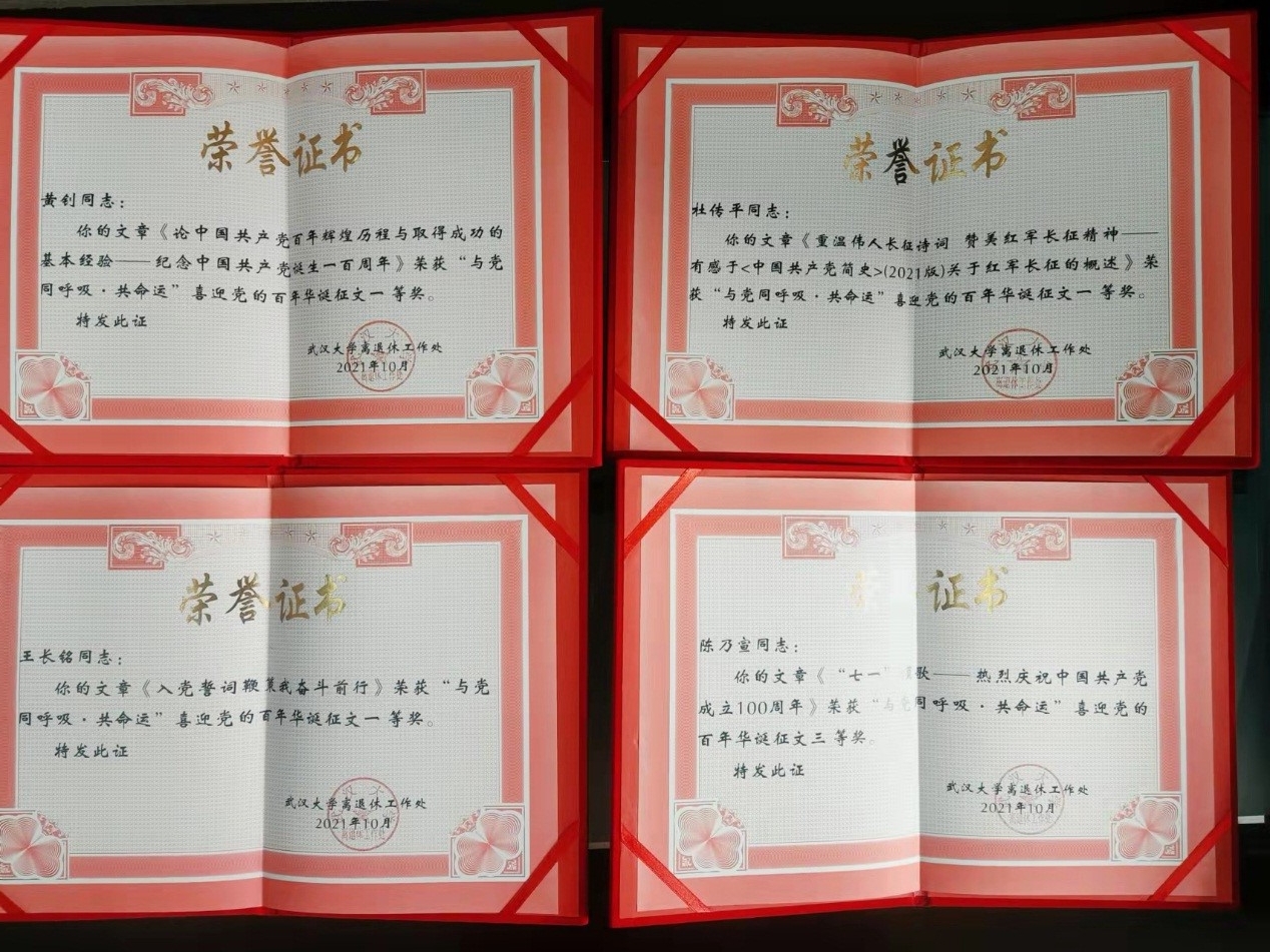 老年协会荣获“优秀组织奖”,其中王长铭教授《入党誓词鞭策我奋斗前行》,杜传平教授《重温伟人长征诗词 赞美红军长征精神——有感于<中国共产党简史(20210版)关于红军长征的概述》、黄钊教授《论中国共产党百年辉煌历程与取得成功的基本经验——纪念中国共产党诞生一百周年》荣获文章类一等奖,陈乃宣教授《”七一“颂歌——热烈庆祝中国共产党成立100周年》荣获文章类三等奖,王长铭教授《六唱母亲——百年华诞唱给母亲的歌》和陈乃宣教授《同舟共济度时艰》荣获诗词类纪念奖。