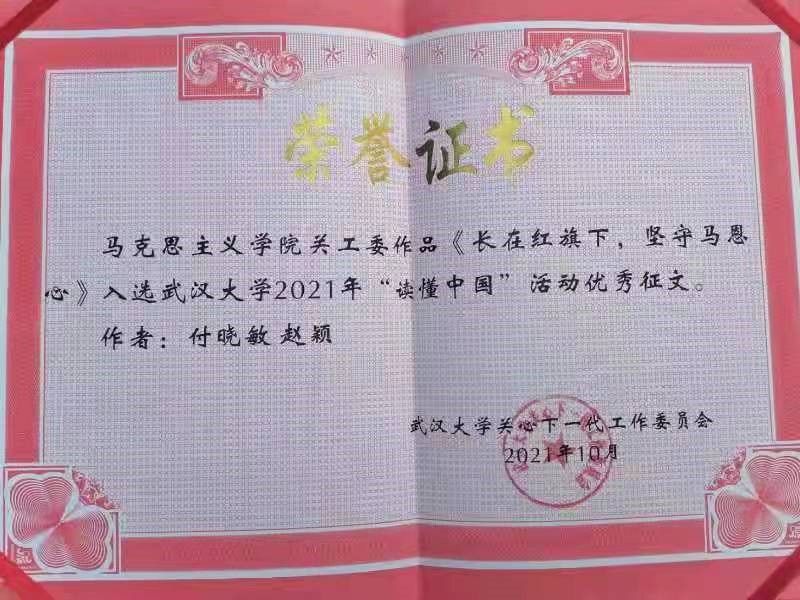 积极组织青年学生和老党员代表进行深入交流,挖掘、记录、整理他们的入党初心和历程及为党奋斗的感人事迹和真实感悟并进行充分展示和广泛传播,取得了很好的教育效果和社会影响。学院关工委被评为“优秀组织单位”;文章《听老教授漫话人生》荣获”最佳征文“称号;文章《初心如磐志高远,奋楫笃行践使命》、《长在红旗下,坚守马恩心》被评为“优秀作品”。