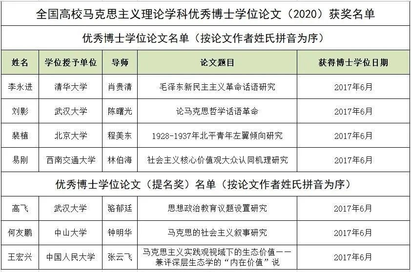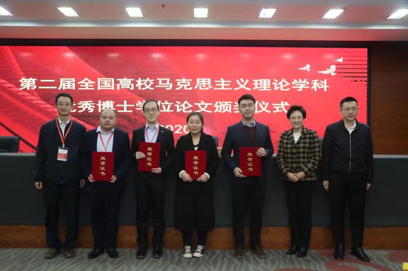 全国高校马克思主义理论学科优秀博士学位论文评选(2020)由全国高校马克思主义理论学科研究会主办,由国务院学位委员会马克思主义理论学科评议组、教育部社会科学委员会马克思主义理论学部、教育部高校思想政治理论课教学指导委员会具体指导,旨在充分发挥马克思主义理论学科的引领作用,进一步加强马克思主义理论学科建设,促进马克思主义理论学科后备人才的成长,充实马克思主义理论研究学术队伍。该评选活动于2019年首次设奖,本年度为第二届。评选工作于4月启动,由各马克思主义理论一级学科博士点及二级学科博士点单位根据要求推荐参评论文,经过通讯评审、会议评审、专家复审、公示等程序,最终6所高校选送的7篇博士学位论文获奖,其中获奖论文4篇,获奖提名论文3篇,学院推选的2篇参评论文双双获奖。